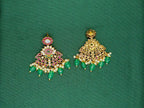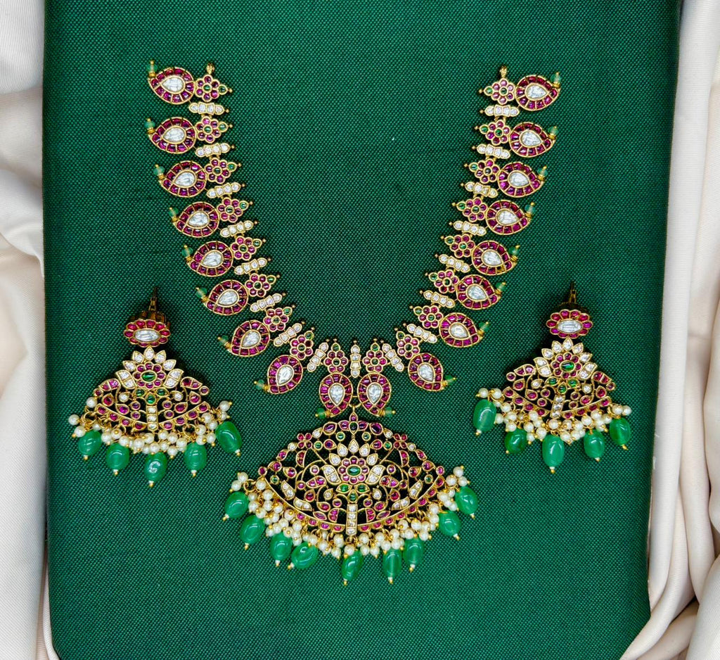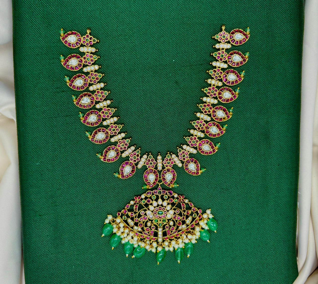 This Jadau Kundan short necklace showcases expert craftsmanship, featuring traditional Kundan work enhanced with vibrant green beads along the lower section. Its elegant design adds a refined touch to any ensemble, making it a versatile choice for both festive occasions and everyday sophistication. The combination of intricate detailing and subtle color contrast ensures this piece stands out gracefully.